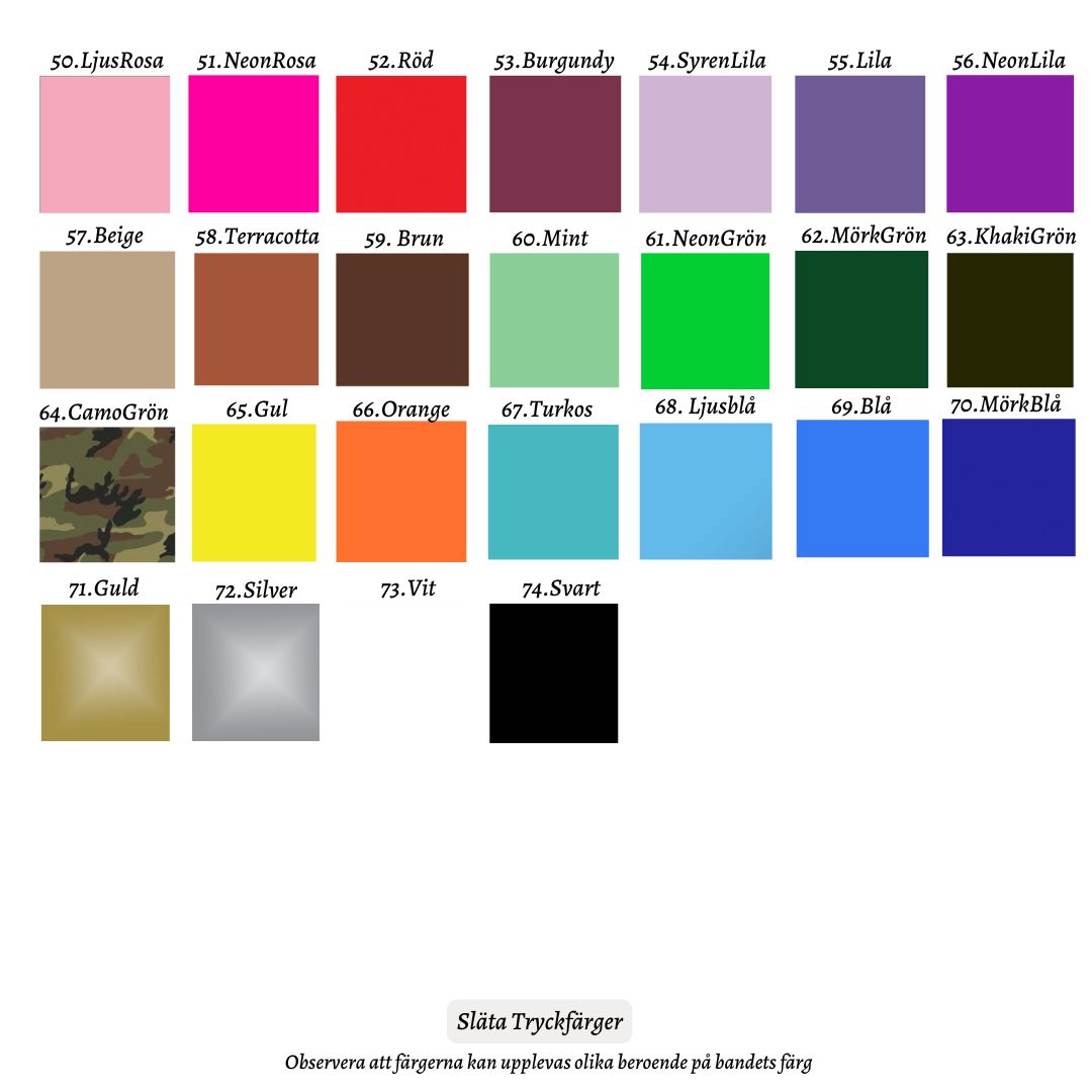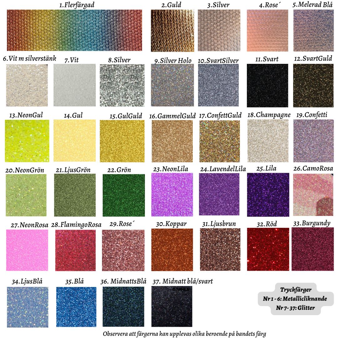 Blå, Brun, Grön, Ljusrosa, Mintgrön, Orange, Plommon, Rosa, Saffransgul, Svart, Syren, Turkos
