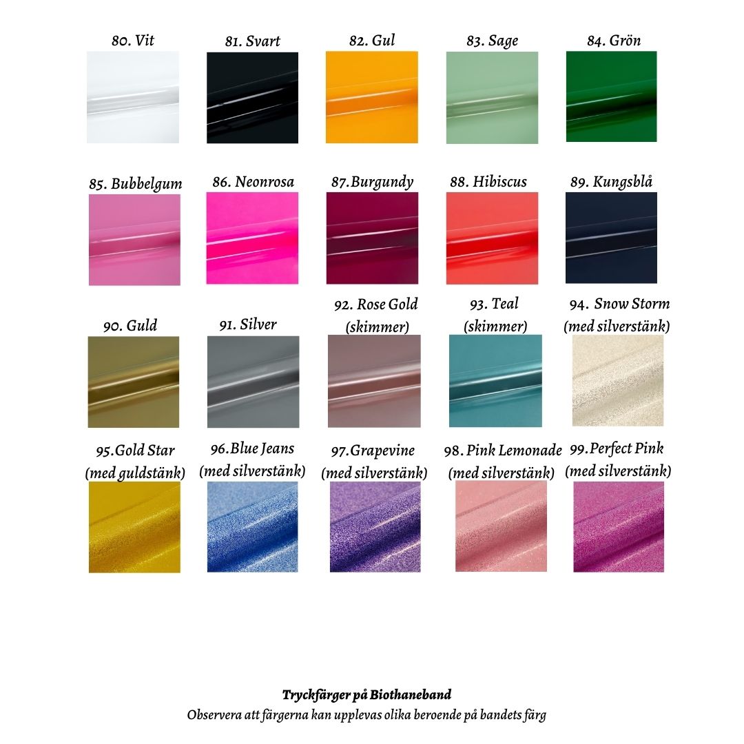 Blå, Marinblå, Brun, Golden Copper, Magenta, Neongul, Neonrosa, pastellrosa, Rosa, Sage Green, Svart, Turkos, Vinröd