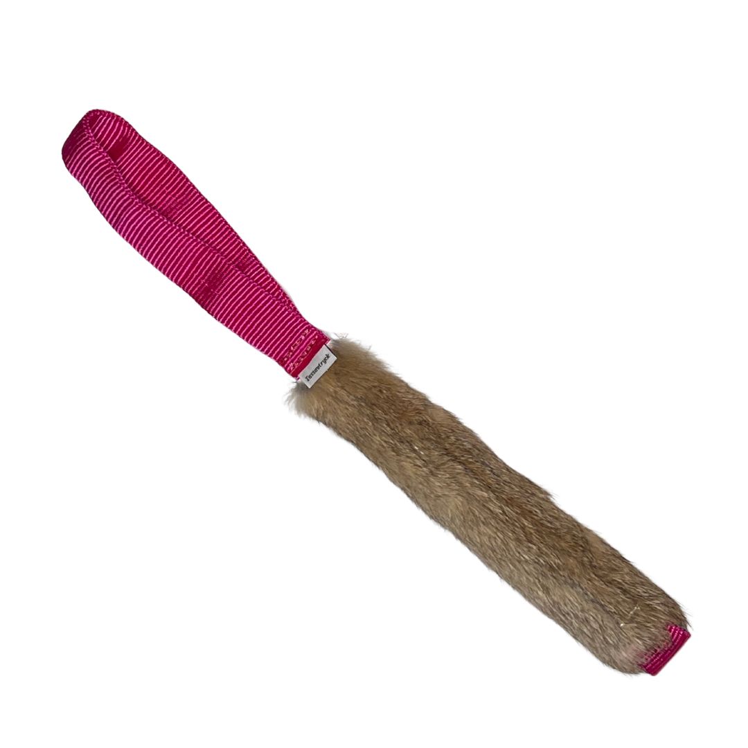 Hundleksak med kaninpäls samt fleecefodrat handtag.